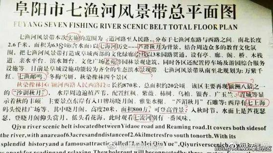 [安徽阜阳一知名景观带介绍 400字不到至少10处错字]七渔河风景带是阜阳市一处知名景观带。然而最近有市民反映,在风景带一幅总平面图上,一段不到400字的介绍却出现至少10处错字,比如“七渔河”写成了“七海河”“七流河”;“景观带”写成了“景现带”…此外一些名词翻译也被指出错,比如一道河被翻译成“Yid⁃aoe。阜阳市旅游局表示,该风景带的标牌并非旅游部门负责,现标牌已经撤下。
