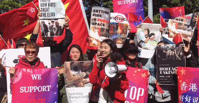 17日的悉尼街头,留学生和爱国华人们举行“爱国护港”和平游行,年轻的女孩带领着人群一遍遍练习“撑警队,惩暴徒”的口号。