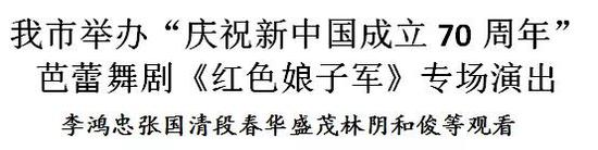 为庆祝新中国成立70周年,昨晚,我市在天津礼堂大剧场举办红色经典芭蕾舞剧《红色娘子军》专场演出。市委书记李鸿忠,市委副书记、市长张国清,市人大常委会主任段春华,市政协主席盛茂林,市委副书记阴和俊等与现场1800位观众共同观看,重温革命历史,传承红色基因,牢记初心、砥砺奋进,激励新时代革命精神、斗争精神、奋斗精神。