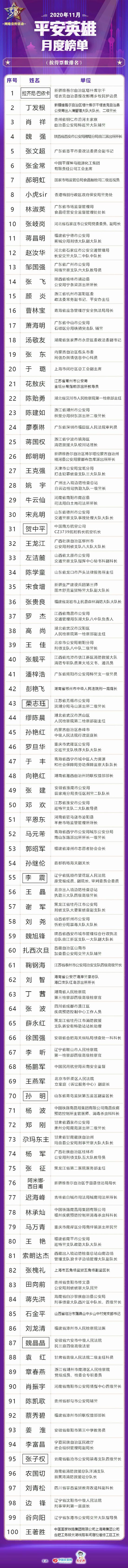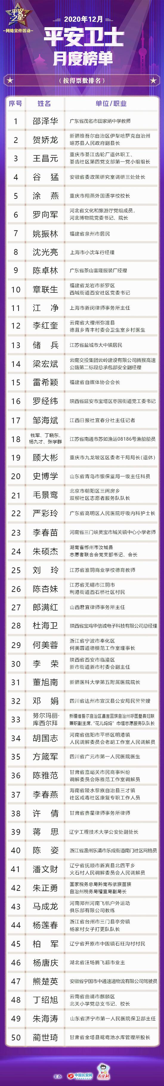 广东省茂名市田家炳中学教师邵泽华,当初悄悄赶赴武汉援建雷神山医院,这次赢得了平安卫士榜第一名。雪地红衣,飞马踏雪,新疆伊犁哈萨克自治州昭苏县人民政府副县长贺娇龙勇夺第二。参加过上甘岭战役的老兵,退休后数十年如一日扎根社区工作的重庆市綦江齿轮厂退休职工王昌元老爷子,荣居第三。