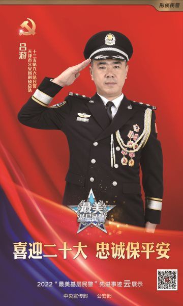 为深入学习贯彻习近平法治思想和习近平总书记关于新时代公安工作的重要论述、重要训词精神,大力弘扬伟大建党精神,激励广大公安民警奋进新征程、建功新时代,中央宣传部、公安部近日向全社会宣传发布2022“最美基层民警”先进事迹。此次活动共评选出38名全国“最美基层民警”,其中,来自天津市公安局刑侦总队十三支队九大队的吕游光荣当选。