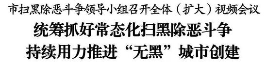 会议指出,以习近平同志为核心的党中央明确指示要有与黑恶势力长期斗争的思想准备,常态化、机制化开展扫黑除恶,为深入持久开展扫黑除恶指明了方向、提供了遵循、明确了路径。要深刻认识到扫黑除恶斗争形势依然艰巨复杂,面对新任务新要求,要深入贯彻落实习近平法治思想,进一步提升政治站位,增强“四个意识”、坚定“四个自信”、做到“两个维护”,以有黑必扫、除恶务尽的鲜明政治态度,以更坚定的决心意志,以更强烈的责任感、紧迫感,持续用力、高压不减,坚决打赢常态化扫黑除恶斗争,持续用力推进“无黑”城市创建。