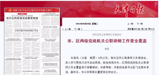 会议指出,在各级党政机关普遍设立公职律师,是以习近平同志为核心的党中央立足全面依法治国全局作出的重要决策部署。要提高政治站位,站在增强“四个意识”、坚定“四个自信”、做到“两个维护”的高度,不折不扣推动公职律师全覆盖,开创全面依法治市、建设高质量法治天津新局面。要坚持实事求是,清醒认识我市公职律师工作中存在的短板、不足和薄弱环节,紧盯目标发力,灵活用好中央政策,切实发挥公职律师作用,健全完善长效机制,完善配套保障制度,以制度机制发力,保障公职律师工作规范有序、高质量发展。要压紧压实第一责任人责任,各级党政机关主要负责同志要按照《党政主要负责人履行推进法治建设第一责任人职责规定》,把公职律师工作作为“一把手”工程摆上位、抓到位,强化公职律师队伍监督管理、督导检查,以严格严密责任体系确保各项任务落地落实见效。