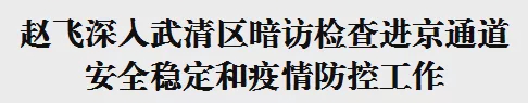 在检查过程中,赵飞要求执勤民警和防疫工作人员要提高政治站位,强化政治担当,从坚定扞卫“两个确立”、坚决做到“两个维护”的高度,立足天津之特、天津之责、天津之卫,坚决履行好首都政治“护城河”、首都防疫“护城河”职责使命。要发扬敢打敢拼、连续作战的优良作风,严之又严、细之又细、实之又实地落实各项安保维稳和疫情防控措施,严把查验环节、守住进京通道,决不能让任何安全隐患和疫情传播风险从我市流入北京。他反复叮嘱公安民警和工作人员,随着春节临近,广大人民群众返乡团圆热情升高,每日离津的车流量、人流量大幅增加,在工作中要统筹处理好管理与服务的关系,既要坚持底线思维、增强忧患意识,把各项安全稳定和疫情防控工作措施落实到位,又要树牢以人民为中心理念,设身处地为群众着想,在政策范围内最大限度方便群众通行,让群众及时安全离津返乡,与家人团聚欢度春节。