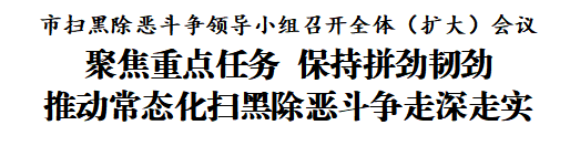会议要求,各单位要紧盯常态化扫黑除恶斗争“十件实事”,坚定“无黑”城市创建目标,坚持深挖整治、长效常治,保持高压严打态势,在扫清、扫尽、扫净上狠下功夫。