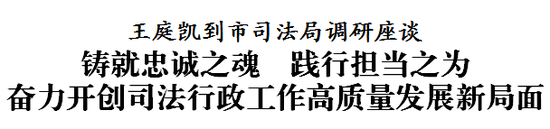 随后,王庭凯主持召开座谈会。在听取市司法局负责同志工作汇报后,他指出,司法行政系统在推进依法治市、维护社会稳定、服务经济社会高质量发展等方面发挥着重要作用。要深入学习贯彻市第十二次党代会精神,扎实开展“迎盛会、铸忠诚、强担当、创业绩”主题学习宣传教育实践活动工作,抓好党代会各项部署要求落实落地,真正把学习成果转化为推动工作的强大动力,教育引导全体干警坚定扞卫“两个确立”、坚决做到“两个维护”,牢记领袖教导、紧跟核心奋斗,开创我市司法行政工作高质量发展新局面。