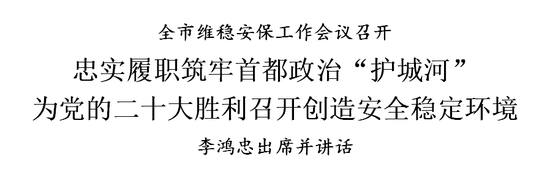 9月20日下午,全市维稳安保工作会议在天津礼堂召开。市委书记李鸿忠出席会议并讲话,强调要深入贯彻落实习近平总书记关于做好党的二十大维稳安保工作的重要指示精神和党中央部署要求,坚定扞卫“两个确立”、坚决做到“两个维护”,进一步强化政治担当,忠实履行“卫城”职责使命,深入推进平安天津建设,全力以赴做好党的二十大维稳安保工作,坚决筑牢首都政治“护城河”。