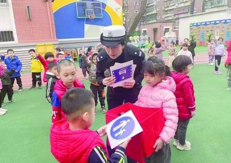 “小朋友们,这是什么交通标志呀?”交警又拿出了迷你交通安全标志牌,和孩子们做起了游戏。交警通过互动的形式,给幼儿们讲解了交通信号灯、人行横道以及各种交通标志的含义。