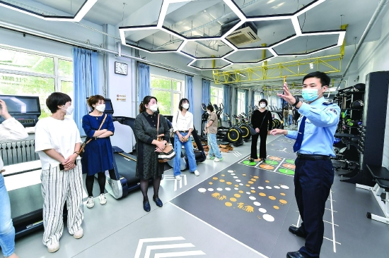 9月25日,公安河北分局在做好疫情防控的基础上,邀请15名民警、辅警家属代表开展“警属进警营,小家连大家”爱警暖警交流参观座谈活动,就开展爱警暖警工作的新思路、新方法、新措施与家属们进行交流,营造“温暖大家庭”的温馨氛围。图为家属代表参观分局健身设施。