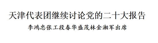 10月17日上午和下午,出席党的二十大天津代表团继续讨论党的二十大报告,酝酿大会选举办法(草案)、推荐监票人。代表团团长、市委书记李鸿忠,代表团副团长、市委副书记、市长张工,市人大常委会主任段春华,市政协主席盛茂林,代表团秘书长、市委副书记金湘军出席。