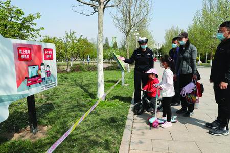 四月梨花开,游客踏春来。游客观赏梨花时,也不由被交通安全展板和设施吸引驻足,于怡人花香下学习掌握了交通安全知识。4月13日10时许,交警南开支队体育中心大队交警来到交通安全主题公园,为游客们发放《天津市道路交通安全若干规定》宣传彩页,讲解日常出行相关的交通安全知识。“这个交通安全元素是今年新加入的,这个创意好,一边游玩一边学习,逛完公园也算通过了一个交通安全‘小测试’。”携妻出游的市民张先生说。