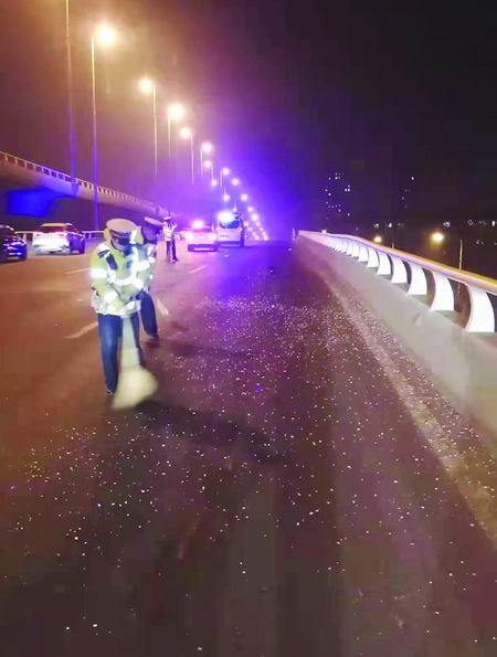 3月9日18时40分许,交警南开支队红旗路大队接报称,快速路雅安桥高点路面第二、三、四条车道碎玻璃散落,造成现场车辆通行不畅。接到这一警情后,该大队立即调派警力赶赴现场,嘉陵警区民警尹桂俊带领辅警杨帆、栗昊晨先行到达现场展开交通疏导,保障过程车辆通行安全。随后,增援警力王鑫带领张旭、吕轩、陈洋三名辅警快速赶到现场,他们拿起扫帚、铁锹,快速而又有条不紊地将大面积散落的碎玻璃清扫完毕,身穿“荧光黄”的他们在较暗的天色中格外显眼,为市民带来通行中的安全感。经过执勤交警、辅警的共同努力,现场道路交通快速恢复畅通。