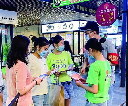 临近傍晚,普法志愿者佩戴好袖标,准备好普法宣传折页和其他宣传品,正式开始在“法治夜市”“摆摊营业”。“这是我们制作的民法典宣传折页,您可以看一看。在日常生活中如果遇到什么法律问题,我们也可以帮您解答……”普法志愿者一边为群众发放普法宣传品,一边普及民法典、《反有组织犯罪法》,以及与创建全国文明城区相关的法律法规等,并用心解答群众提出的法律问题。“真没想到,逛个夜市还能学到法律知识,你们这种宣传方式真的是太‘接地气’了!”一位刚咨询完法律问题的大娘说道。