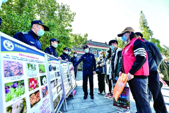 10月10日上午,河北区宁园街基层社会治理“警民大联盟”启动仪式在北宁公园举行。活动现场设置反诈、禁毒、打假、普法以及创文创卫五大展台,通过设置展板、发放宣传单、文艺演出等形式,向群众普及安全防范和法律知识,现场解答咨询,传递安全理念。图为民警结合展牌宣讲禁毒知识。
