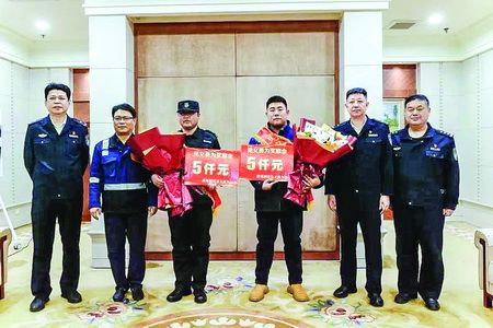 日前,受天津市见义勇为协会委托,滨海新区见义勇为协会相关负责人来到天津港集团,向天津东疆湾景区员工王猛、蒋永生颁发市、新区两级见义勇为荣誉证书和奖励金。