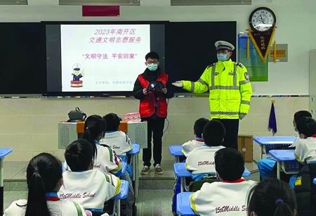 为进一步做好中学生交通安全宣传教育,切实提高学生交通安全防范意识和自我保护能力,2月20日,交警南开支队白堤路大队交警联合闪闪红星志愿服务队、郁美净集团志愿团队深入天津市第二十五中学开展交通安全主题宣传活动。