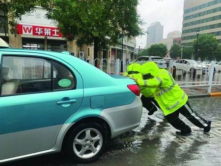 7月6日7时50分许,河东支队六纬路大队交警和辅警在六纬路与九经路交口执勤时,发现一辆出租车在附近行车道内停留许久,询问得知,该车在涉水时遭遇熄火动弹不得。交警和辅警立即将该车推移至路边不影响交通的位置,保障出租车安全等待救援。