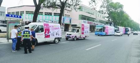 日前,公安宝坻分局交警支队城关大队交警在宝坻城区南城东路开展行动时,发现5辆慢速行驶的机动车车身四周,都贴满了“某某电动车”字样的标语。因这些车上的图案非常醒目,吸引不少过往群众围观。5辆车均以极慢的速度前行,甚至影响到了该路段的正常交通,交警立即上前示意该车队车辆靠边停车接受检查。