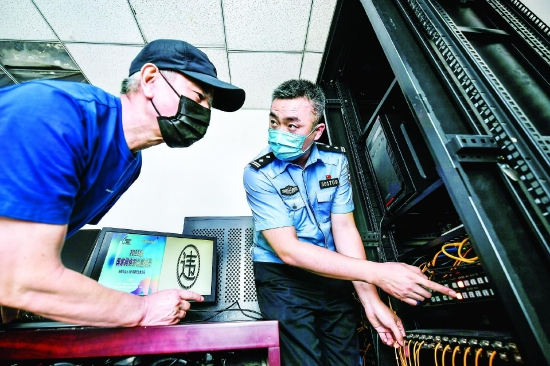 近日,公安南开分局网安支队联合多部门对辖区楼宇商超的LED屏控制系统开展全面检查梳理工作,通过明白纸等多种形式宣传落实相关安全保护措施,切实加强网络安全建设。图为民警在商场的LED屏幕控制室进行网络安全检查。