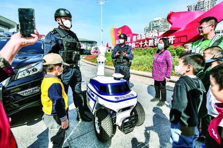 近日,市公安局特警总队三支队试点运行智能机器人辅助勤务。这款智能机器人采用人工智能、物联网等技术,具备自主感知、自主行走能力以及实时音频回传、人脸识别、远程语音对讲等功能,成为特警执行巡逻任务的好帮手。图为特警队员向群众介绍智能机器人。