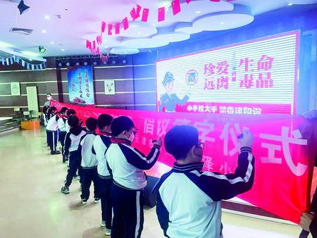 ▲ 东丽区禁毒办组织开展校园禁毒宣传,面向全区51所学校发出倡议,总计2万余名学生参与签名承诺。